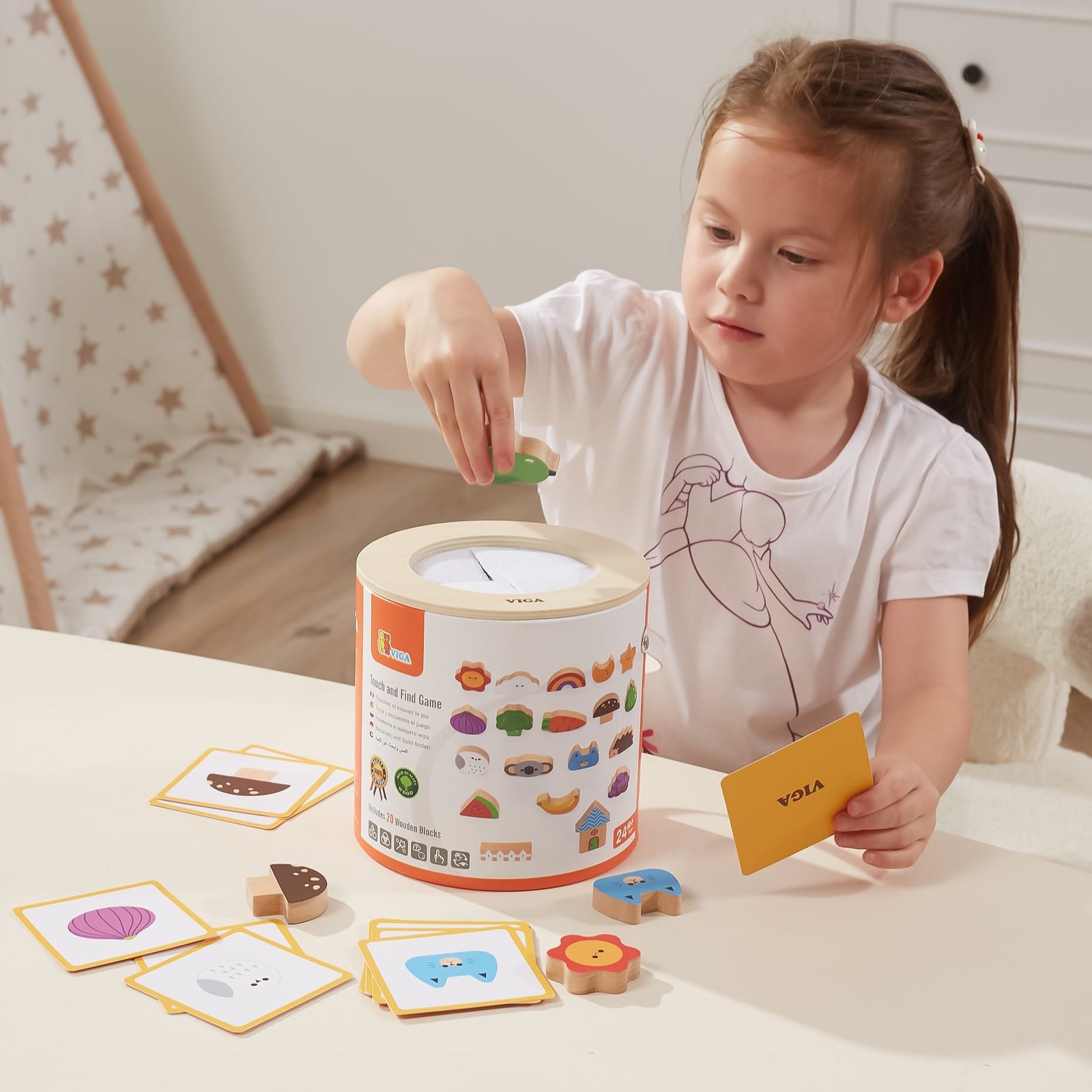VIGA medinis jutiminis žaidimas „Paliesk ir suderink“ – tai lavinantis Montessori tipo žaislas, kuris skatina vaikus pažinti formas, spalvas ir tekstūras naudojantis vien lytėjimu.